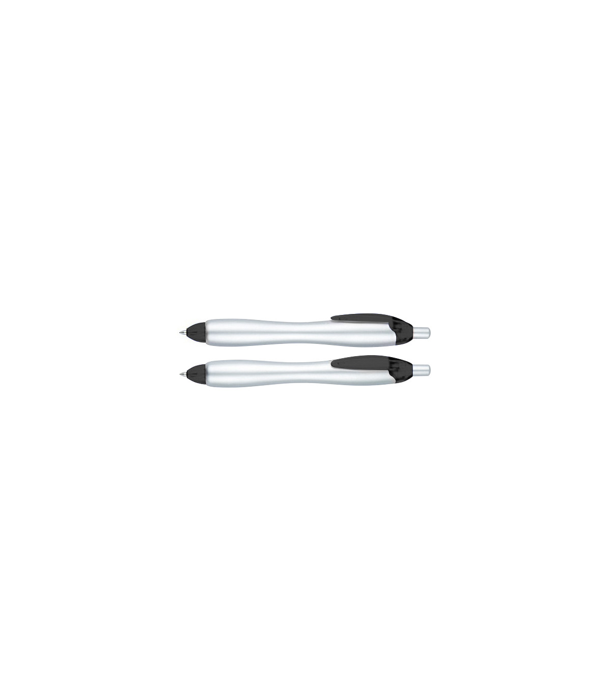 Bolígrafo "Gordito Silver" con cuerpo plateado opaco y terminales de color translúcido. Escritura azul.