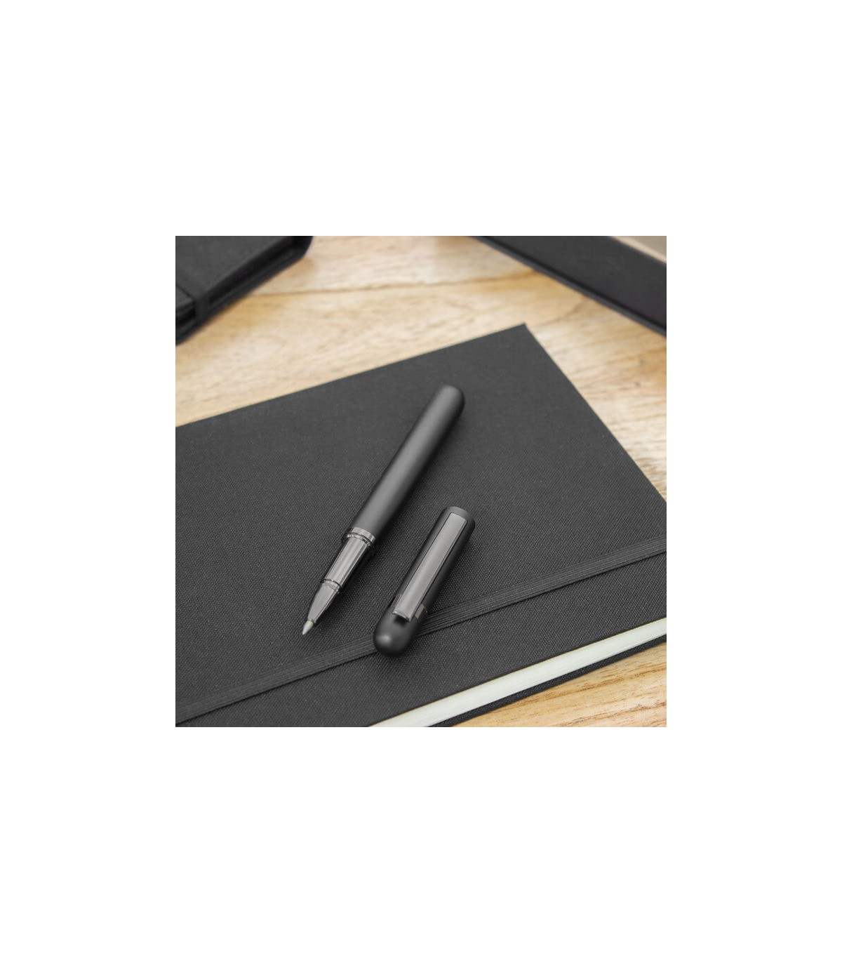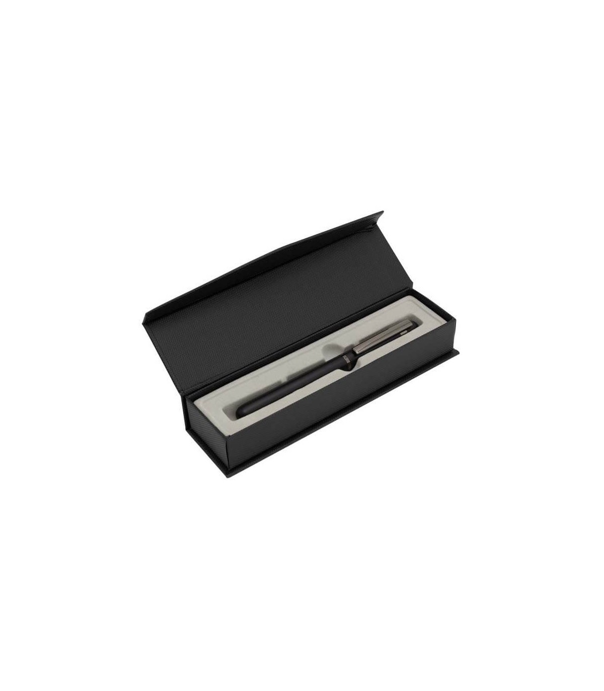 Metal. Cuerpo de aluminio. Roller. Apertura con tapa a presión. Clip y anillos metálicos color plata. Tinta Azul. Decapa color plata tanto en el cuerpo como en la tapa. Presentación en estuche con cierre magnético.